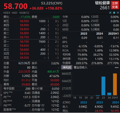 与诺比侃一同大涨的还有轻松健康。招股书显示,该公司在中国提供健康相关及保险相关解决方案。根据沙利文报告的资料,按 2024 年的收入计,公司在中国数字综合健康服务及健康保险服务市场排名第 10 位。按 2024 年的收入计,公司在中国数字健康服务市场排名第七。