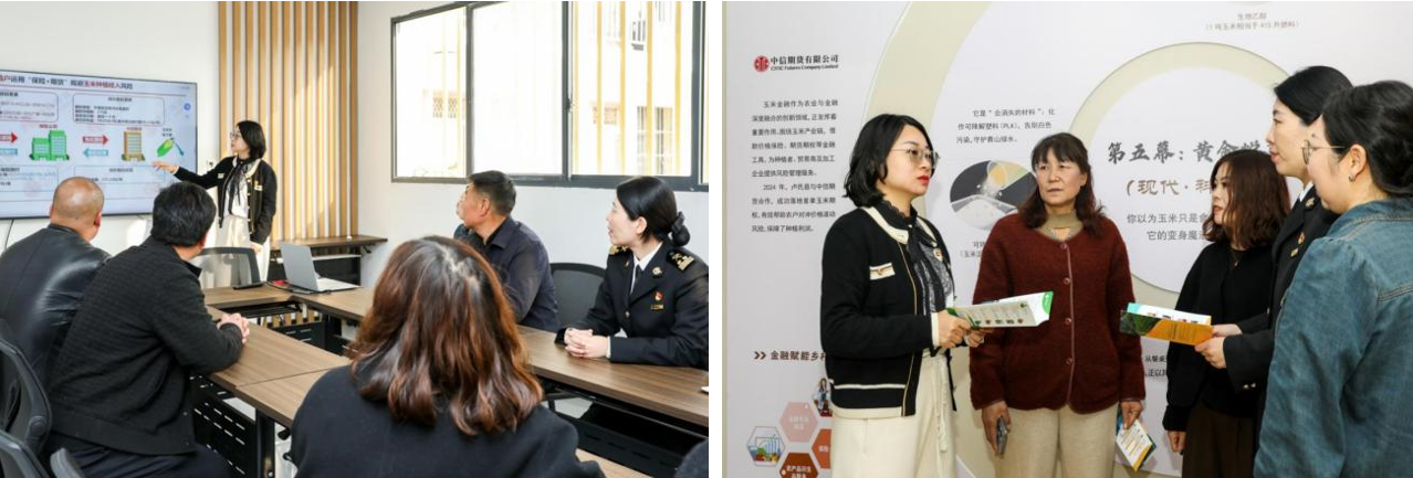 在乡村振兴座谈会上,双方围绕玉米种植等特色产业展开深度研讨。针对农户最关切的价格波动问题,厦门分公司团队结合当地种植规模,现场为农户讲解了玉米 「保险+期货」 金融工具的基本原理与应用场景,帮助农户理解如何利用期货市场规避价格波动风险,稳定种植收益。