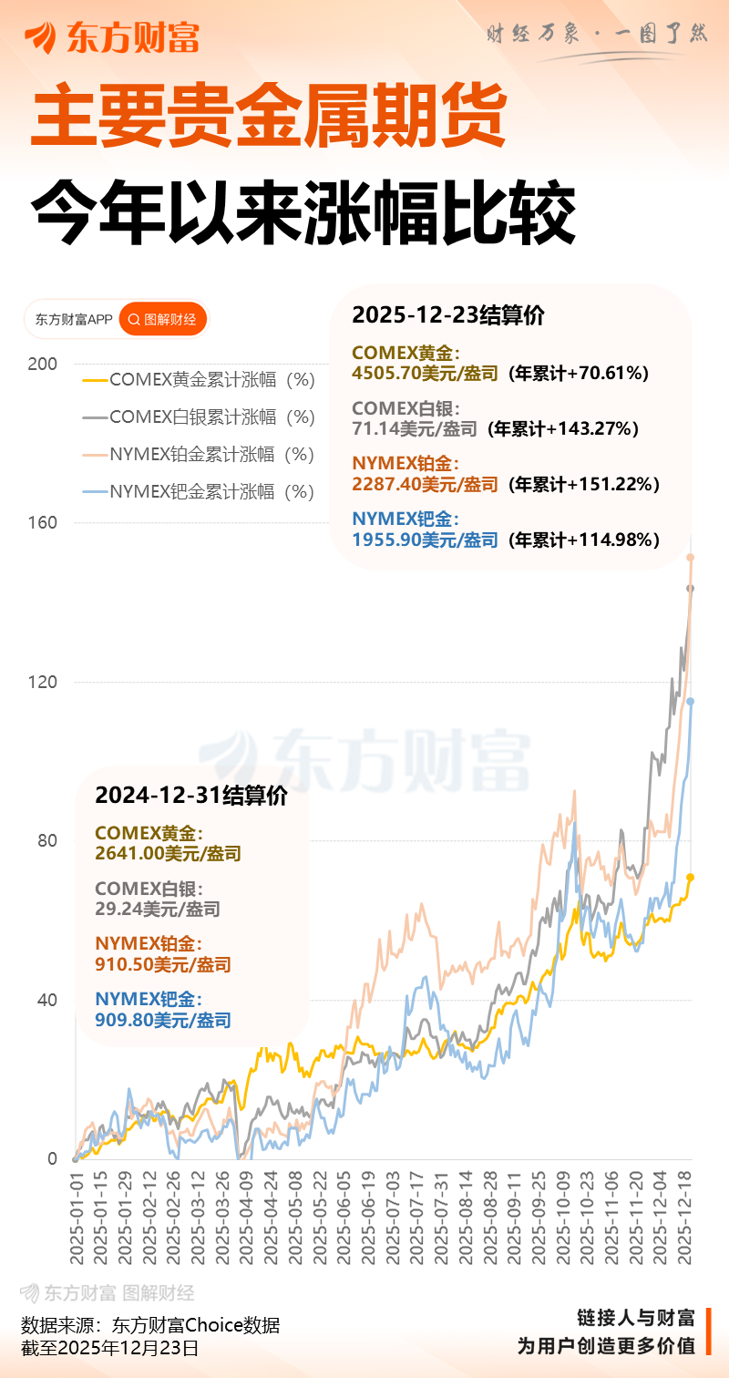 12 月 24 日,现货黄金继续拉升,盘中最高触及 4525.70 美元/盎司,再创历史新高,截至发稿稍有回落,报 4498.36 美元/盎司。数据显示,现货黄金价格年内上涨了约 1880 美元/盎司,涨幅超过 70%。