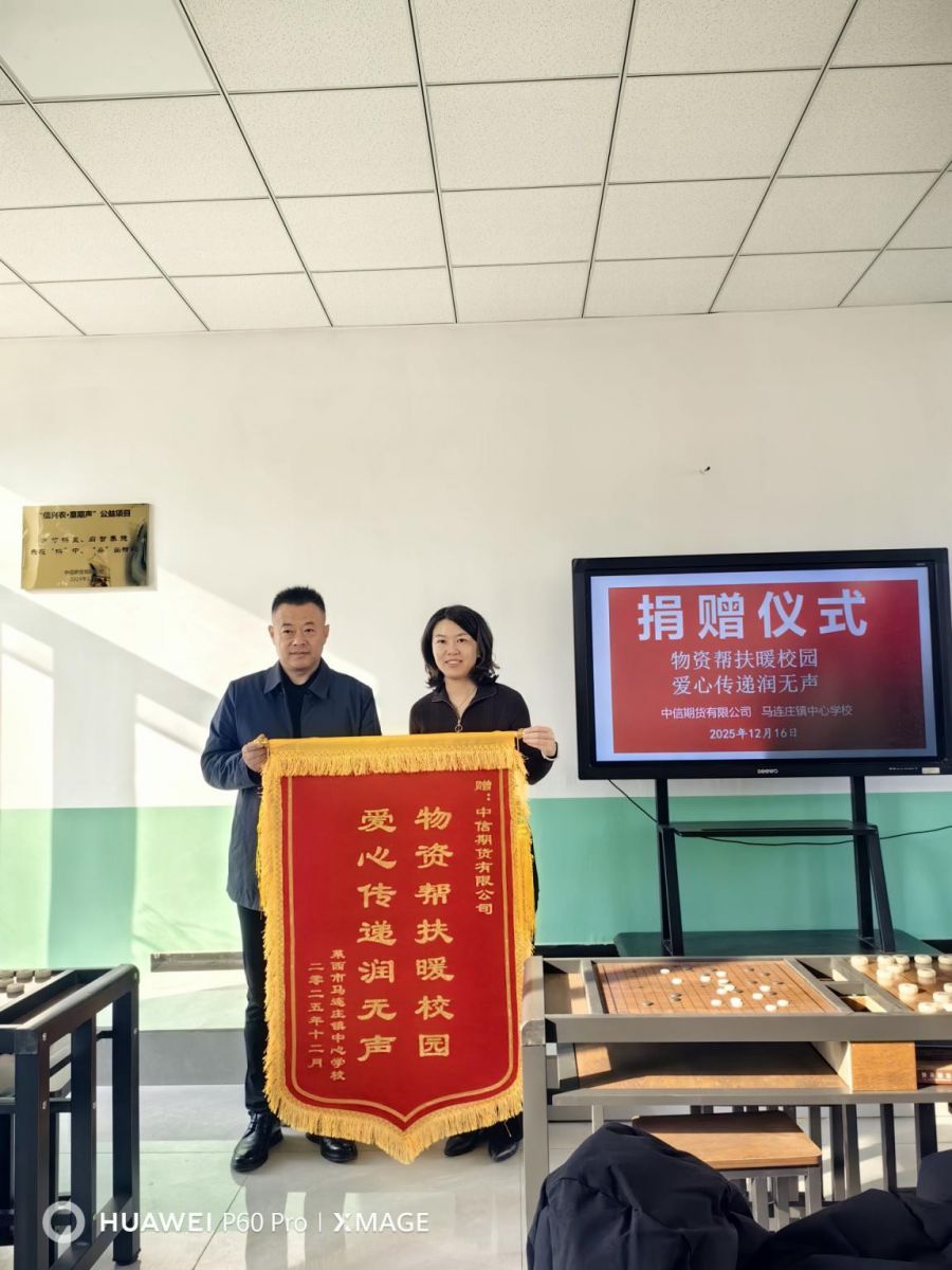 2025 年 12 月 16 日,马连庄镇中心学校洋溢着温馨的气氛,一场简朴而真挚的爱心捐赠仪式如期举行。中信期货山东分公司代表、马连庄镇镇政府代表与全校师生共同见证围棋象棋桌椅、棋类教具挂图等物资正式移交校方,为乡村校园增添了一抹充满智慧与温度的亮色。