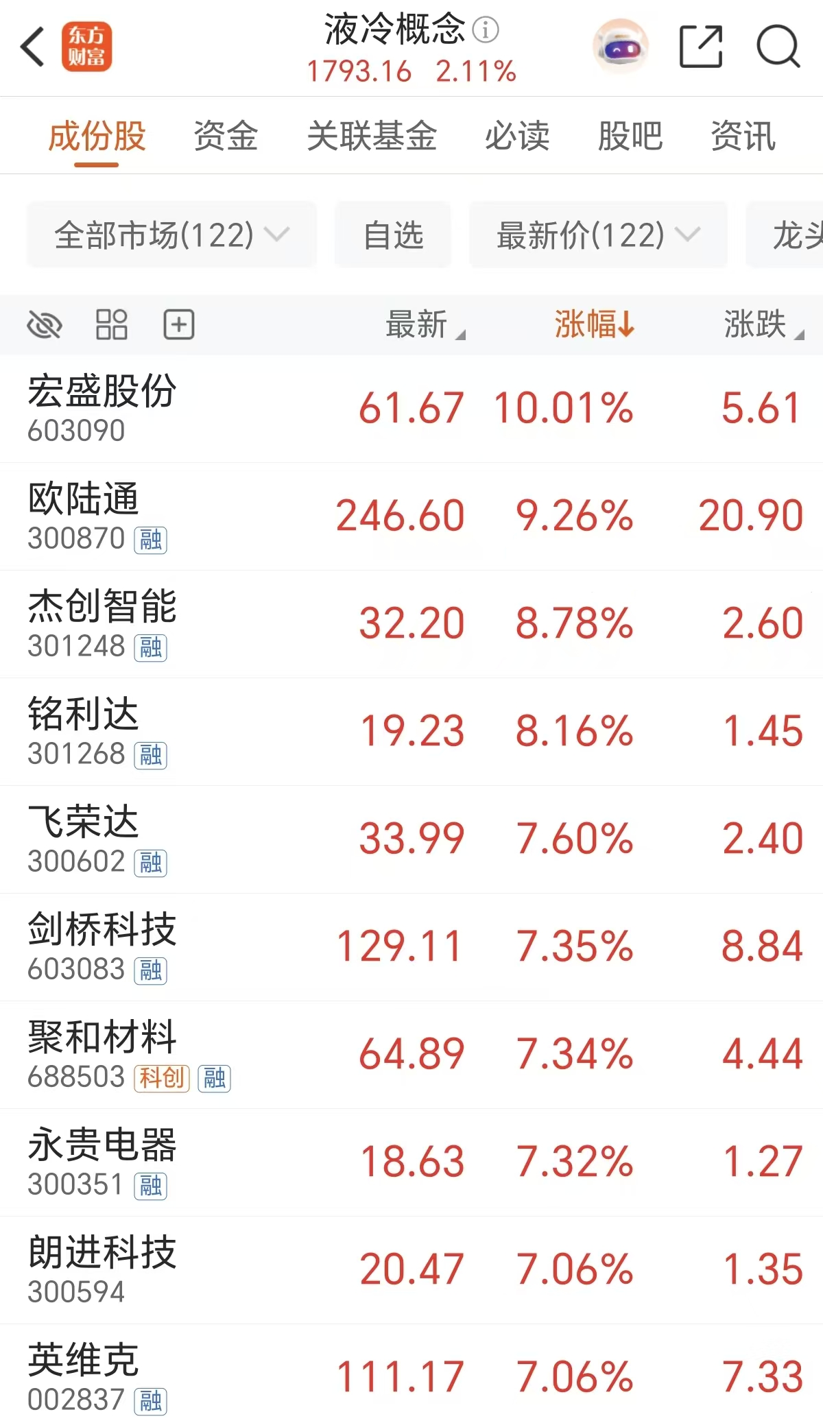 周三 (12 月 24 日) 液冷概念延续涨势,宏盛股份涨停,欧陆通涨超 9%,杰创智能、铭利达涨超 8%。