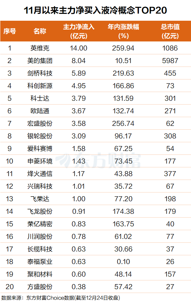 东方财富Choice 数据显示,11 月至今主力资金抢筹了一批液冷概念股,英维克排名第一,主力净买入 14 亿元;美的集团排名第二,主力净买入超 8 亿元。