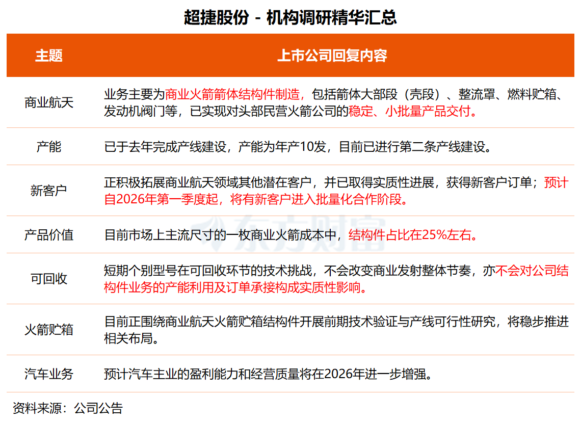 超捷股份昨日接受国金证券、招商基金等 8 家机构调研,公司在交流中透露,公司今年以来持续拓展新的商业火箭客户,并已取得实质性进展,获得新客户订单。预计自 2026 年第一季度起,将有新客户进入批量化合作阶段。