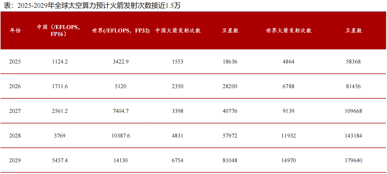 招商证券指出,我国火箭发射需求进入快速增长期。根据中国信通院/IDC 等预测,2025 年中国算力规模预计达到 1124 EFLOPS(每秒百亿亿次浮点运算),到 2029 年将达到 5457 EFLOPS,期间 CAGR(复合年增长率) 为 49%,预计 2029 年,全球算力总规模将达到 14130 EFLOPS,期间 CAGR 达 45%。