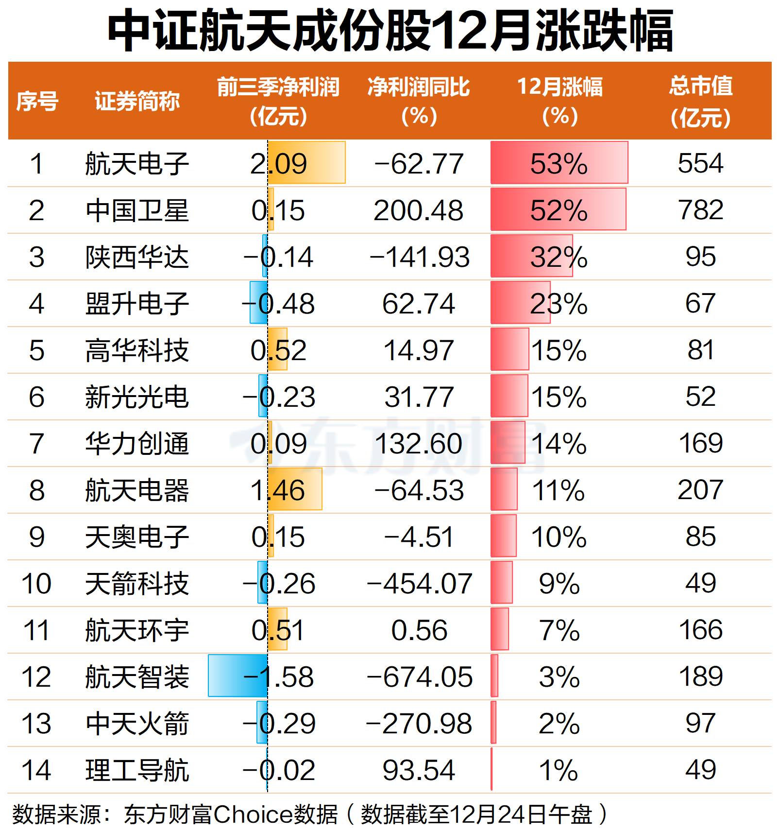 A 股方面,在近期商业航天热点频出的背景下,中证航天行业 14 只成份股本月均出现上涨。据东方财富Choice 数据,截至 12 月 24 日午盘,航天电子、中国卫星当月均涨超 50%,陕西华达涨超 30%,盟升电子涨超 20%,高华科技、新光光电、华力创通、航天电器、天奥电子等涨超 10%。