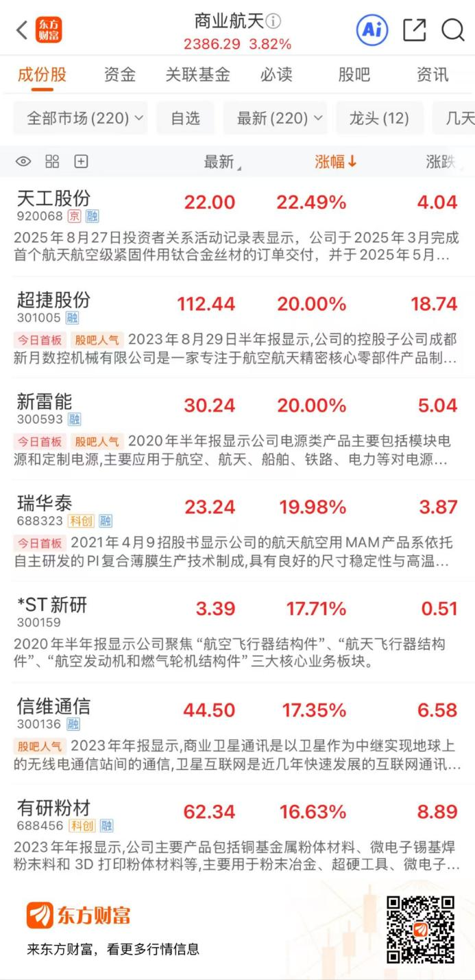 商业航天概念继续活跃。12 月 24 日,A 股商业航天概念高开高走,截至早间收盘,板块上涨 3.82%。个股方面,天工股份涨超 22%,超捷股份、新雷能、瑞华泰20CM 涨停,*ST 新研、信维通信、有研粉材、天银机电霍莱沃涨超 10%,九鼎新材、中超控股、创元科技、神剑股份、上海港湾、九丰能源、中国卫星、国机精工、普利特、星网宇达、大业股份、博云新材等十余股涨停。