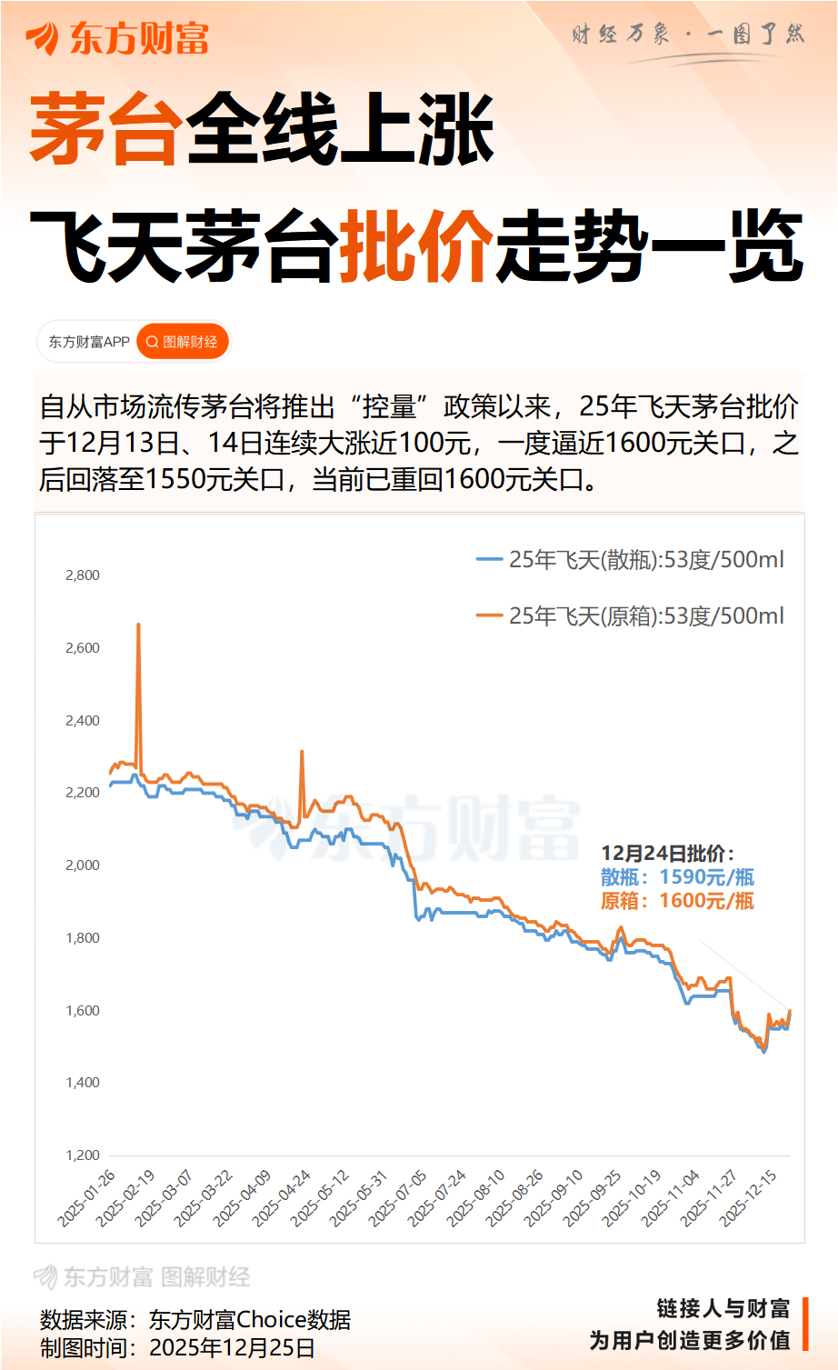 记者留意到,自从市场流传茅台将推出 「控量」 政策以来,25 年飞天茅台批价于 12 月 13 日、14 日连续大涨近 100 元,一度逼近 1600 元关口,之后回落至 1550 元关口,当前已重回 1600 元关口。