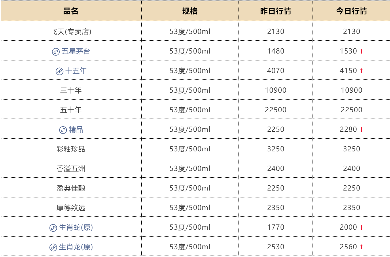 此外非标产品涨幅显著,散花飞天报 2480 元/瓶,较上一日涨 100 元;茅台十五年报 4150 元/瓶,较上一日涨 80 元;精品茅台报 2280 元/瓶,较上一日涨 30 元;生肖蛇原箱报 2000 元/瓶,较上一日涨 230 元;彩釉珍品报 3250 元/瓶,与上一日持平。其中,生肖蛇原箱批价单日涨 230 元,茅台十五年两日涨 300 元,涨幅尤为明显。