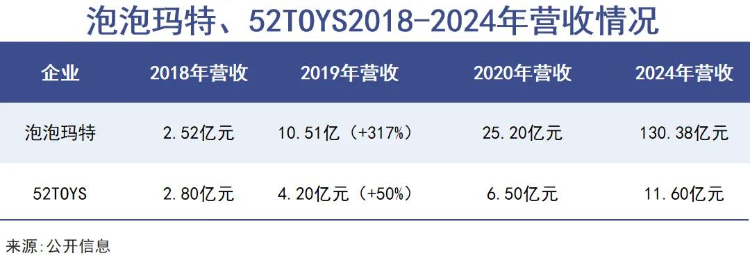2018 年时 52TOYS 营收曾经压泡泡玛特一头。到 2019 年,52TOYS 实现了 50% 的营收增速,但同年泡泡玛特却迎来了 317% 的大爆发。究其根本,在于二者对 IP 孵化的态度有别。