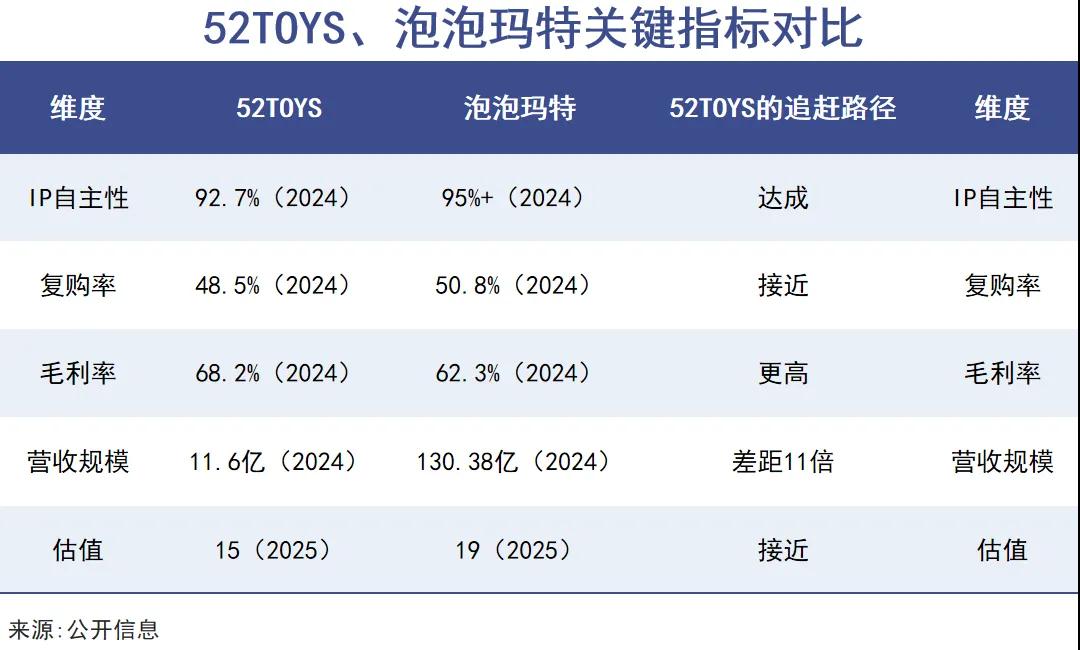 如果说卡游与泡泡玛特是形似神不似,那 52TOYS 可以说是形神兼具的同类。自主 IP、高毛利、强复购一样不少。中金的研究报告中曾经写道,「52TOYS 是唯一具备独立上市能力的国产潮玩 IP 公司,若 2026 年重启 IPO,估值有望达 25 亿元」。