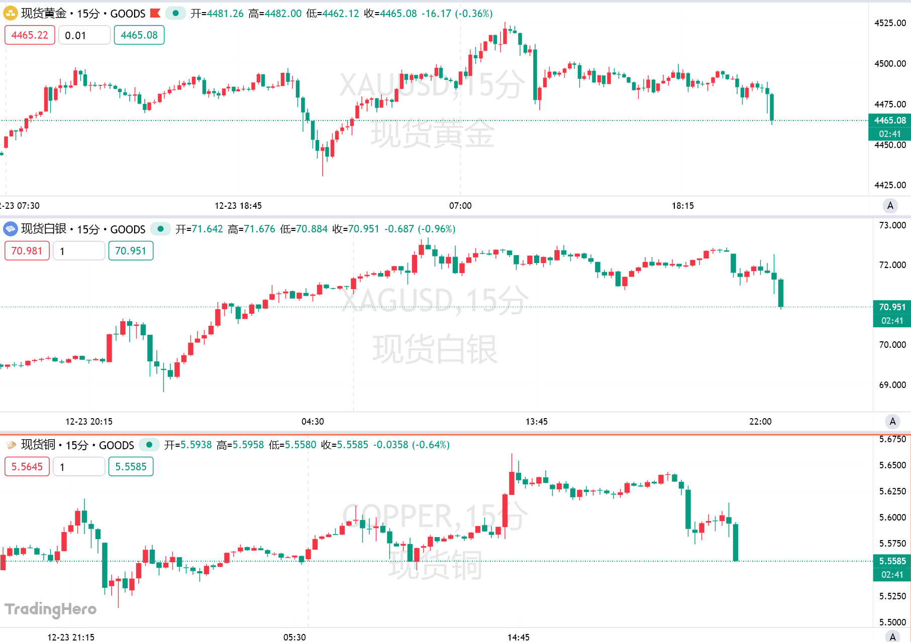 不过,截止发稿,金银铜价格均有所回落。国际现货黄金短线跌幅扩大至 20 美元,最低触及 4462.12 美元/盎司。国际现货白银、纽约期银均跌破 71 美元/盎司。