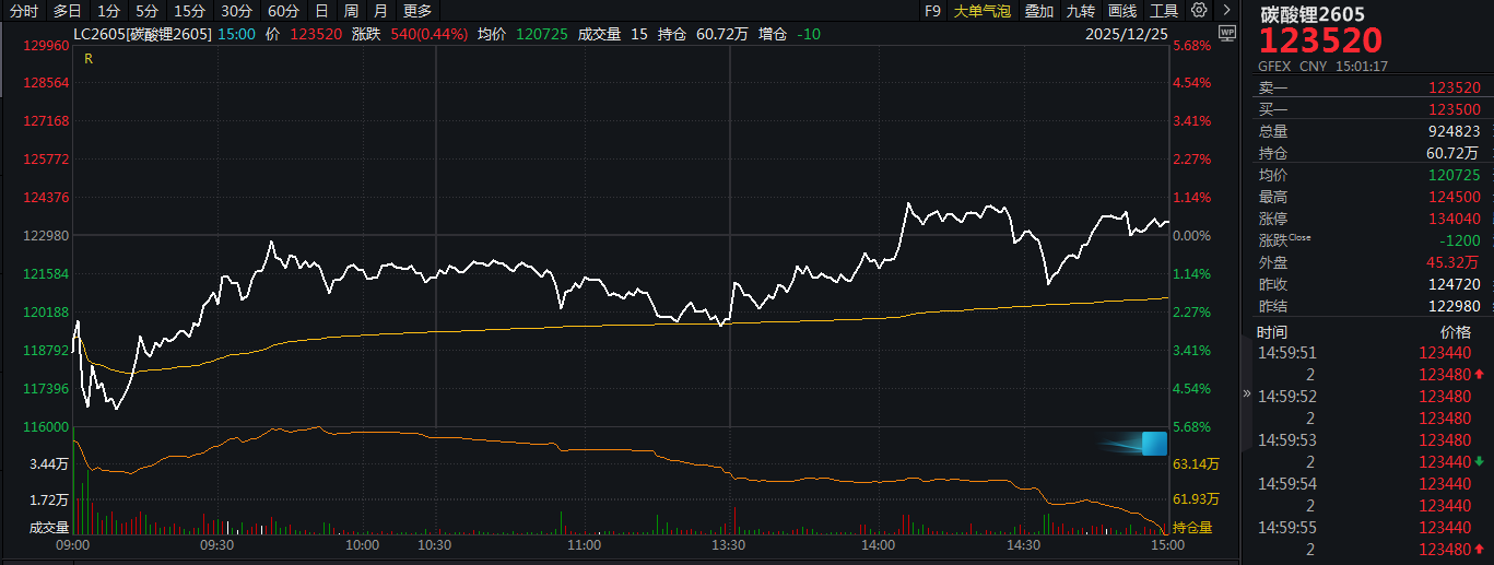 12 月 23 日,广期所决定,自 2025 年 12 月 25 日交易时起,将碳酸锂期货 LC2605 合约的交易手续费标准调整为成交金额的万分之三点二,日内平今仓交易手续费标准调整为成交金额的万分之三点二。