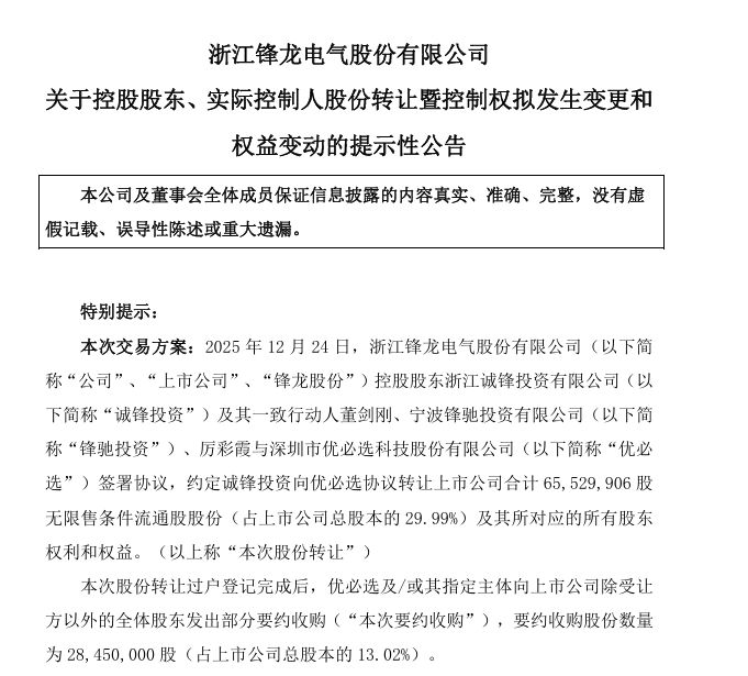 锋龙股份表示,此次股份转让过户登记及表决权放弃后,公司控股股东将由诚锋投资变更为优必选,实控人由董剑刚变更为周剑。公司股票自 12 月 25 日起复牌。