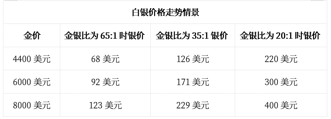 黄金价格向每盎司 6000 至 8000 美元的潜在走势,为白银价格达到三位数提供了数学模型支撑。结合历史金银比分析,这些模型表明白银的升值潜力将远超黄金。从金银比潜在变动逆推银价的情景分析如下: