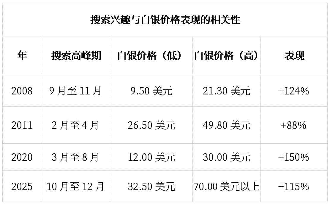 谷歌趋势数据显示,贵金属搜索词的搜索量激增与价格重大转折点之间存在相关性。例如,「如何购买白银」这一搜索词在 2025 年 12 月达到了历史最高水平,而这与历史上重要的市场转折点相吻合。