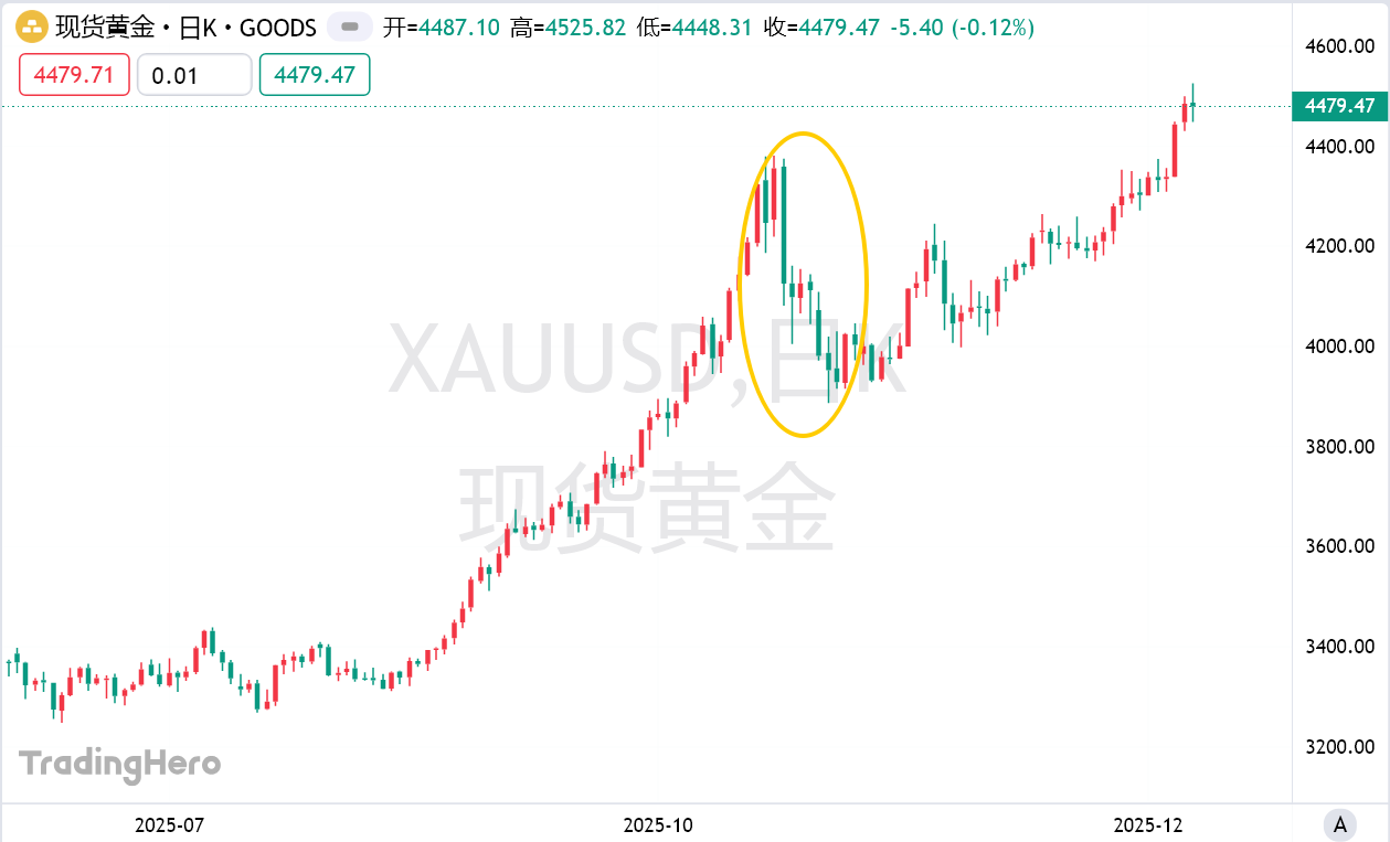 然而,13 天后,一场教科书级的 「多头清洗」 降临。10 月 21 日,金价一度暴跌 6.3%,创下十余年最大跌幅。这并非基本面逆转,而是在历史绝对高位下,由技术性抛售与多头杠杆集体断裂引发的踩踏式去杠杆。它向所有交易者发出冰冷警告:即便是最强的趋势,也从不直线运行。