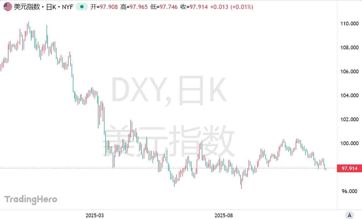 上半年美元指数跌幅高达 10.8%,从 1 月中旬的 110 关口骤降至 7 月 1 日的 96.37 低点,创下自 1973 年布雷顿森林体系瓦解以来最糟糕的上半年表现。期间,4 月 19 日跌近 2%,6 月 19 日起连跌 9 个交易日,9 月 17 日美联储降息当日再创微幅新低至 96.21。前三季度美元指数跌幅约达 12.5%,今年下半年大部分时间里仍徘徊在 12 个月低点附近。