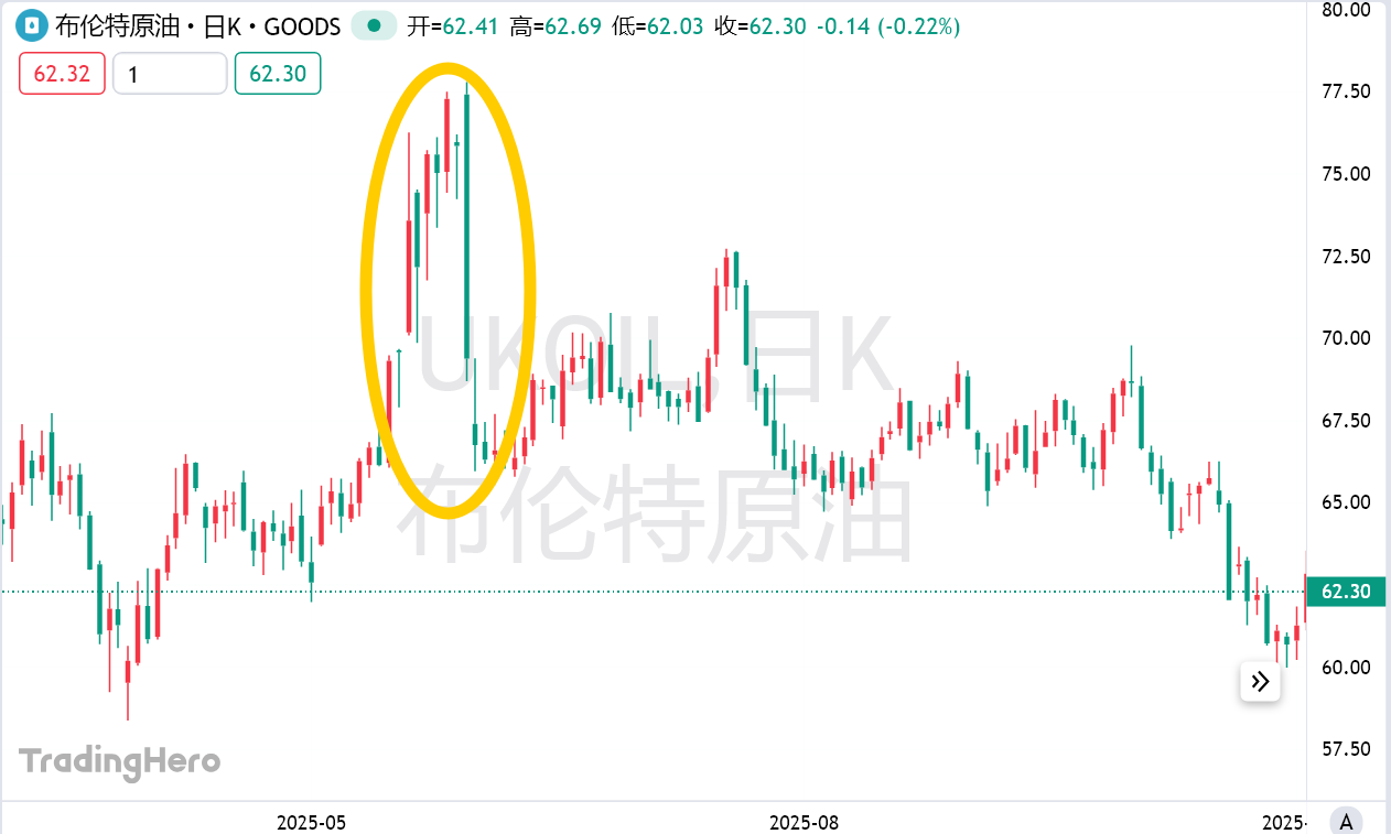 然而,战争溢价被证明是短暂的。几天之内,市场认识到实际的供应中断依然有限,伊朗的石油生产基本未受干扰。恐惧的泡沫迅速破裂。6 月 23 日,油价暴跌近 9%,连跌三天,跌超 12%,并开启震荡下行通道。截至撰文时,布油交投在 62 美元附近。