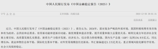 12 月 26 日,中国人民银行发布 《中国金融稳定报告 (2025)》(下称 《报告》),对中国金融体系的稳健性状况进行全面评估。