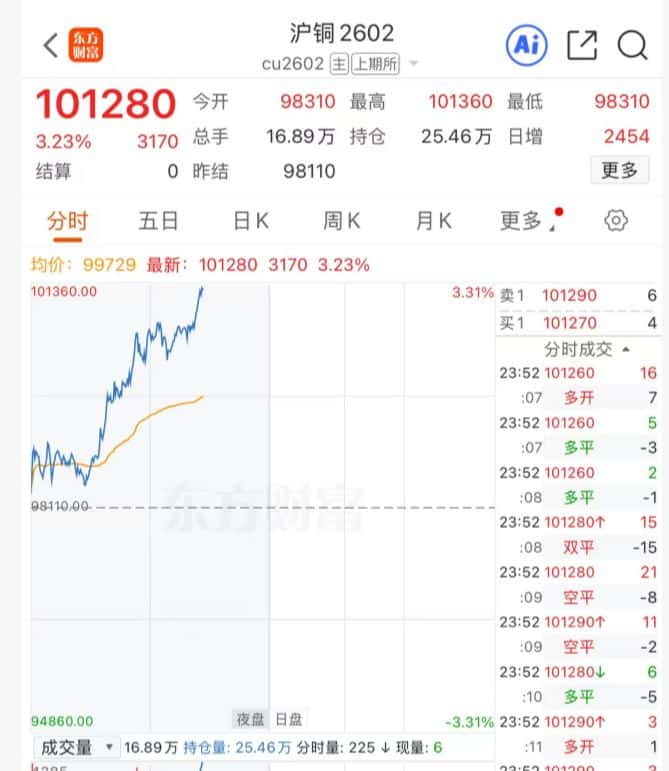 上海期货交易所的铜期货价格站上每吨 10 万元人民币关口。纽约商品交易所 (COMEX) 的铜期货价格暴涨超 5%,创下今年 7 月铜市出现史无前例逼空行情后的新高。