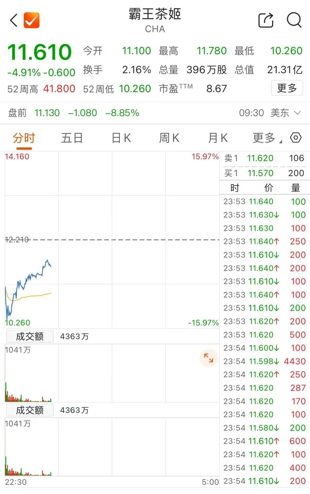 北京时间 12 月 26 日晚间美股开盘后,霸王茶姬美股大跌,盘中一度跌超 14%,股价创上市以来新低。截至发稿,跌幅有所收窄。