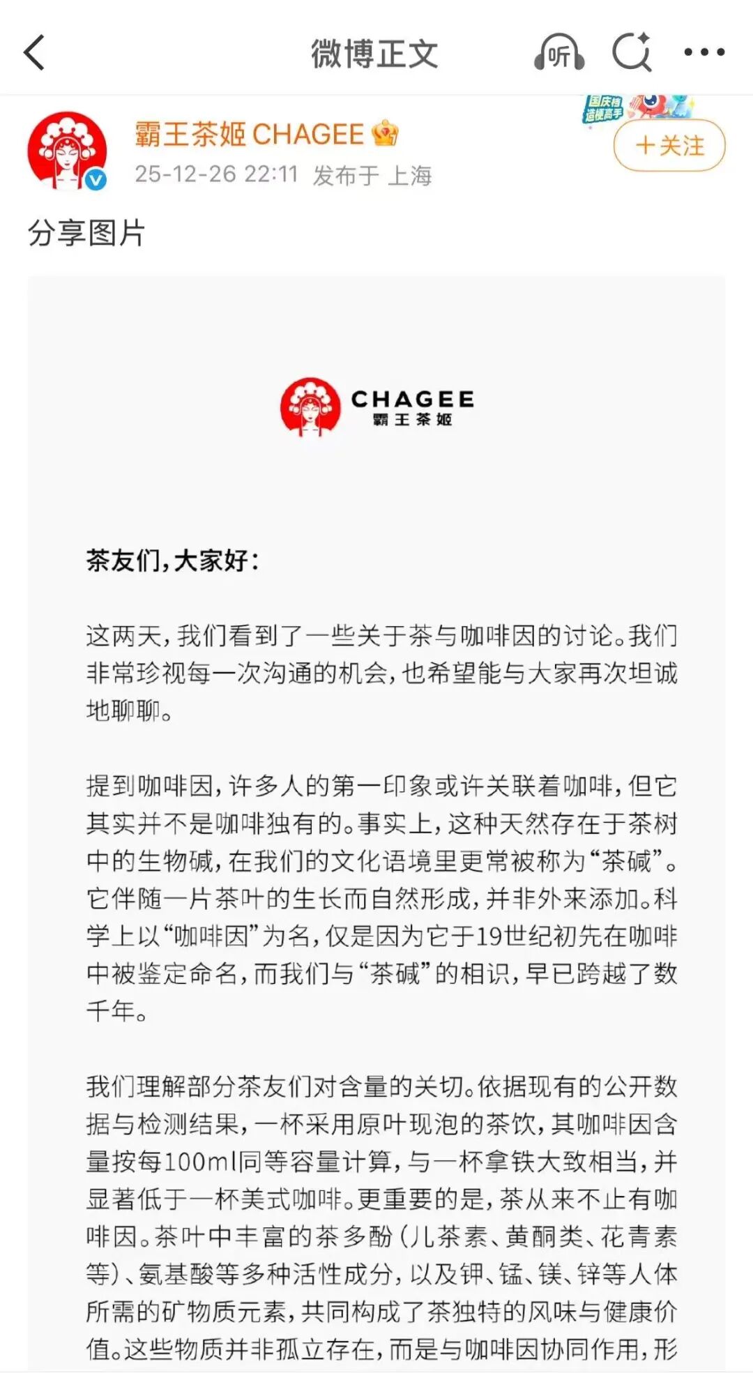 12 月 26 日晚间,霸王茶姬官方微博回应了关于 「咖啡因」 的争议。霸王茶姬表示,依据现有的公开数据与检测结果,一杯采用原叶现泡的茶饮,其咖啡因含量按每 100 毫升同等容量计算,与一杯拿铁大致相当,并显著低于一杯美式咖啡。霸王茶姬坚持使用原叶茶汤,而非茶碎、茶末或工业风味剂,这的确可能使茶味更为醇厚饱满,咖啡因的天然含量也相对呈现。霸王茶姬今年 3 月推出的 「轻因·伯牙绝弦」 在保留核心茶本味的同时,咖啡因含量降低了约 50%。