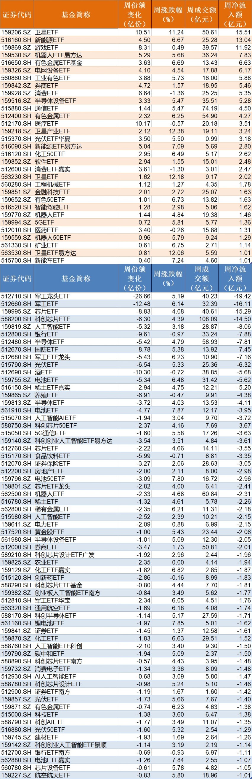 行业主题上看,卫星、新能源等 ETF 被资金看好,而军工相关 ETF 被资金抛售。