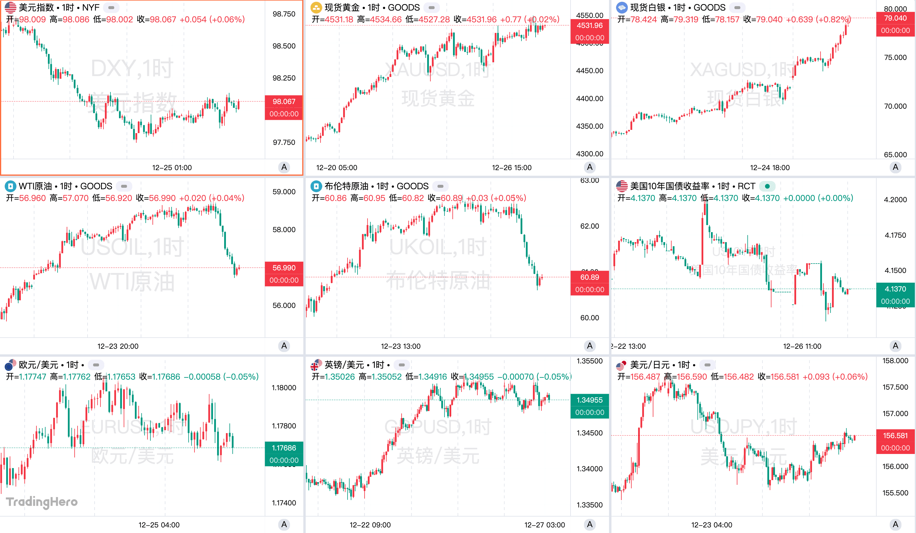 本周,美元指数整体偏弱运行,周五收于 98.07,下跌 0.67%。周一开盘后持续下行,周二进一步跌破 98 关口,反映市场对美联储明年降息预期有所升温,之后虽然出现技术性反弹,一度重回 98 附近,但力度有限,全周仍处相对低位震荡。