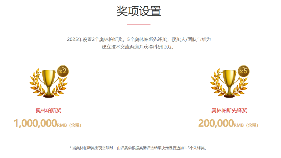 据悉,本次将评选出 2 个 「奥林帕斯奖」 和 5 个 「奥林帕斯先锋奖」。获奖个人或团队不仅将分享总计 300 万元的高额奖金,更能与华为建立深度的技术交流渠道,获得进一步的科研资源支持。评选将综合考量参评者已取得的科研成果价值,以及针对悬赏难题所提出的后续研究计划在技术前瞻性、创新性和潜在商业价值等多维度的表现。