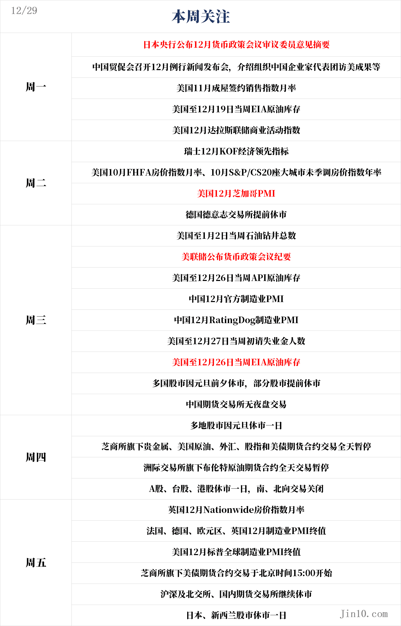 下周,由于元旦假日,美国并没有什么重要数据将公布。