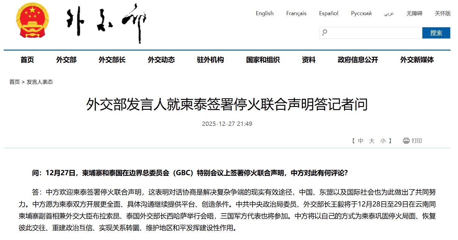 问:12 月 27 日,柬埔寨和泰国在边界总委员会 (GBC) 特别会议上签署停火联合声明,中方对此有何评论?
