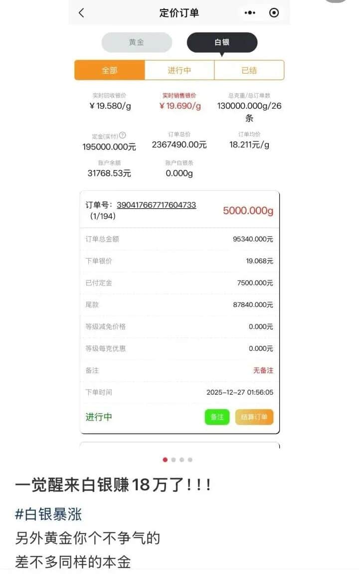 随着白银上演史诗级行情,有人在社交媒体发文称,一觉醒来赚了 18 万元,黄金不争气......