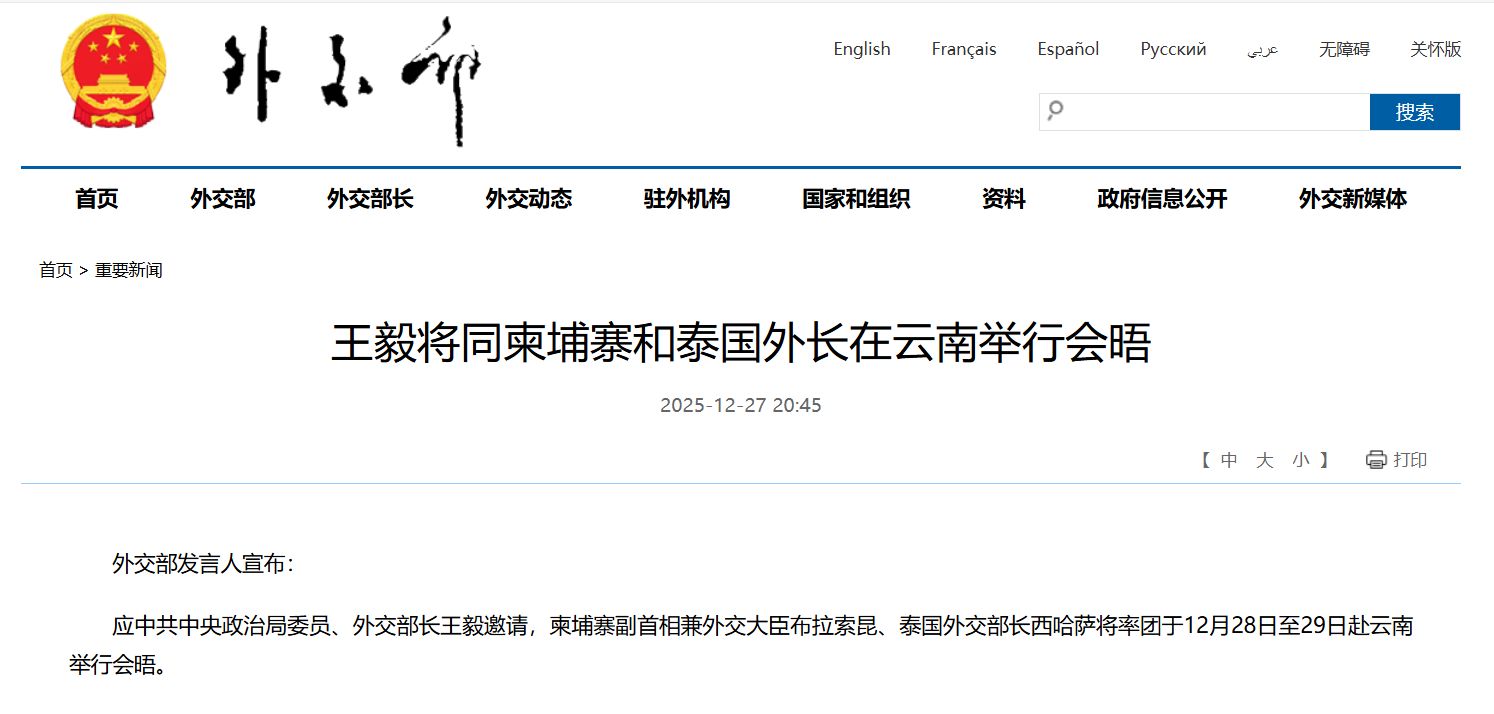 应中共中央政治局委员、外交部长王毅邀请,柬埔寨副首相兼外交大臣布拉索昆、泰国外交部长西哈萨将率团于 12 月 28 日至 29 日赴云南举行会晤。