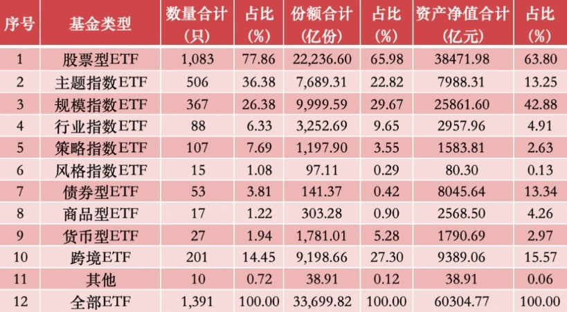 澎湃新闻记者据 Wind 数据统计,截至 12 月 27 日,国内 ETF 总规模已突破 6 万亿元关口,达 6.03 万亿元。其中,股票型 ETF 占据主导地位,规模为 3.85 万亿元;跨境 ETF 规模为 9389.06 亿元,债券型 ETF 规模为 8045.64 亿元,商品型 ETF 规模为 2568.50 亿元,货币型 ETF 规模为 1790.69 亿元。