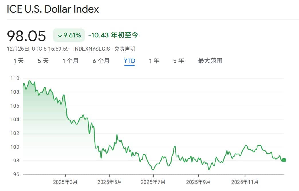 ◆2025 年收官之际,全球金融市场迎来关键变局:金属全线狂飙,纷纷刷新历史纪录,非美货币集体走强;而美元指数年内跌幅近 10%,恐创下 2003 年以来最差年度表现。美元走弱的背后,既是美联储独立性遭政治干预引发的危机,也是美国经济结构失衡、关税与通胀阴霾叠加的结果。中国现代国际关系研究院原副院长王在邦指出,强美元周期告一段落,弱美元周期可能开启。