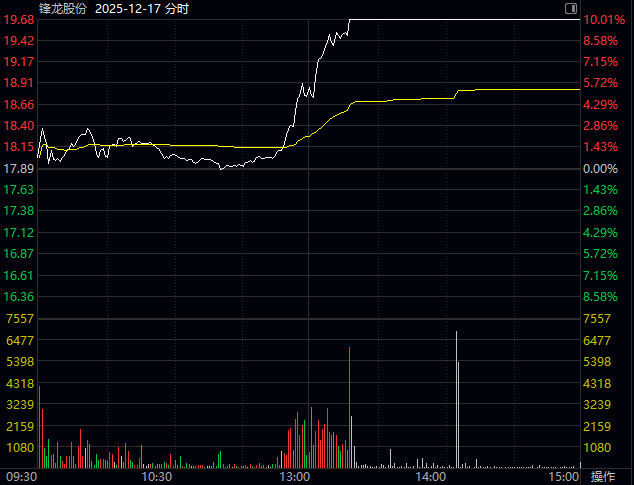 锋龙股份在停牌前一个交易日,早盘大部分时间还在平盘线附近振荡,11 时 15 分左右突然拉升,午盘开盘后不久便涨停封板。