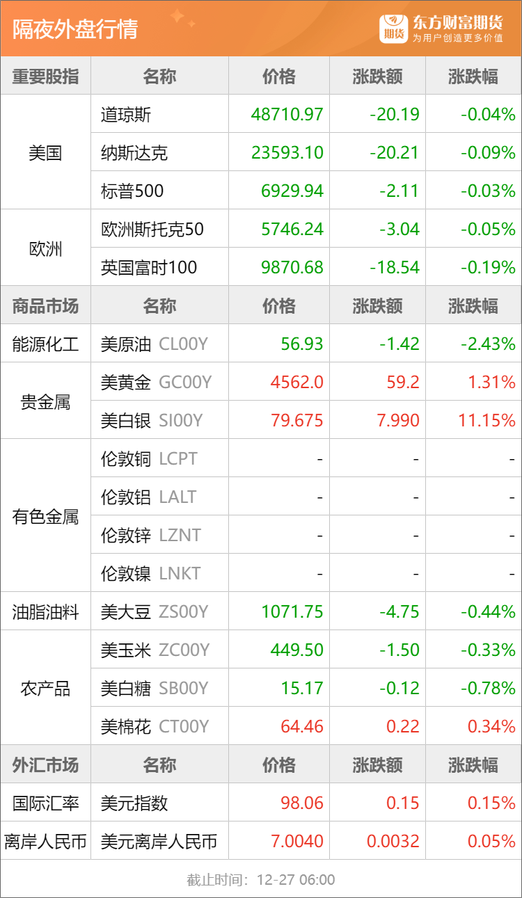 大豆:据 Mysteel,12 月 20 日至 12 月 26 日,国内油厂大豆实际压榨量 206.44 万吨,较前一周实际压榨量减 6.62 万吨,较预估压榨量低 5.62 万吨;实际开机率为 56.79%。(我的钢铁网)