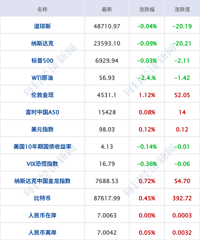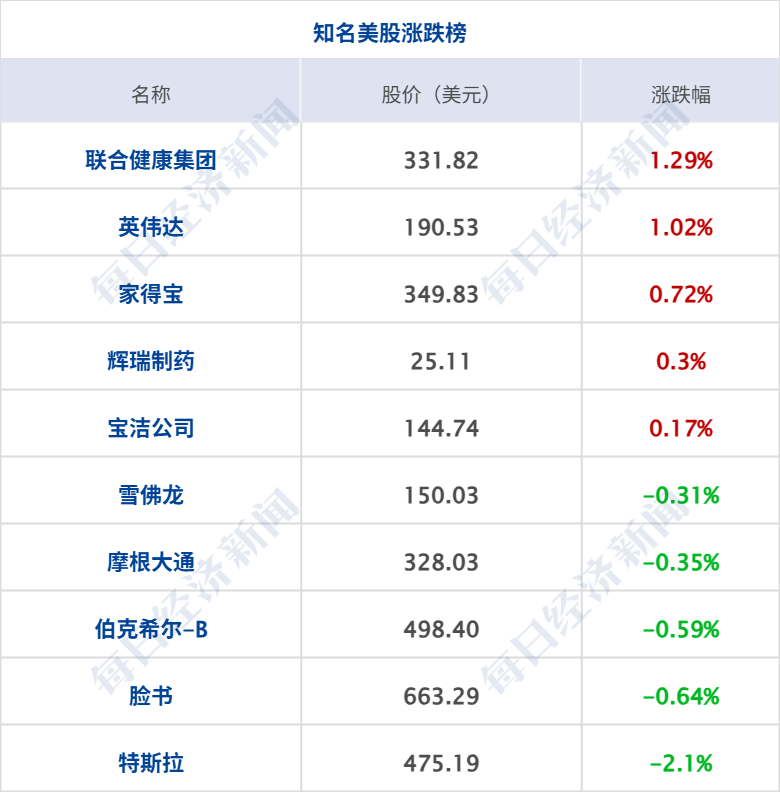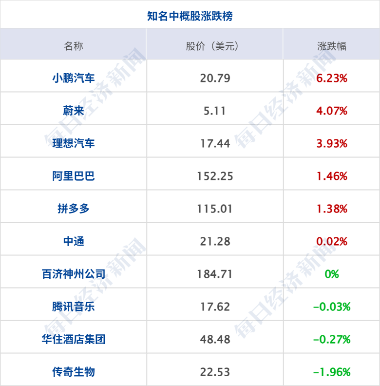 美股三大指数收盘均微跌,纳指跌 0.09%,道指跌 0.04%,标普 500 指数跌 0.03%,大型科技股涨跌不一,特斯拉跌超 2%,谷歌、苹果、微软、Meta 等小幅下跌;英伟达涨超 1%,亚马逊、奈飞、英特尔小幅上涨。纳斯达克中国金龙指数涨 0.72%,中概股多数上涨,小鹏汽车涨超 6%,蔚来涨近 4%,阿里巴巴、百度涨超 1%;霸王茶姬跌 2.54%。