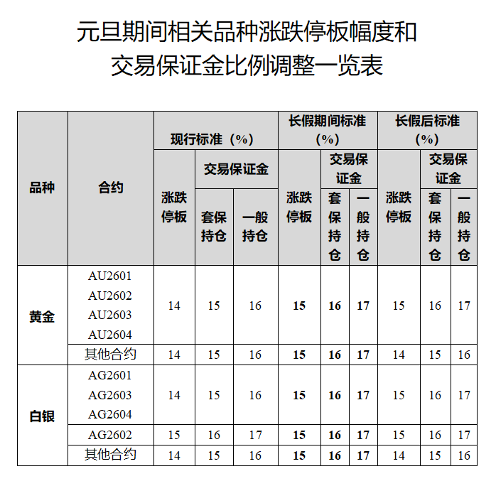元旦假期临近,上期所同日发布 《关于 2026 年元旦期间有关工作安排的通知》,对黄金、白银相关期货合约的涨跌停板幅度及交易保证金比例做出调整。