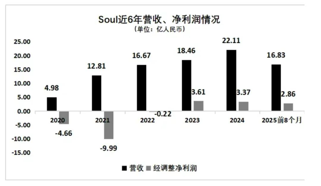 这组数据背后是一系列更耐人寻味的数字:截至 2025 年 8 月,Soul 月活跃用户为 2800 万,较 2021 年 3160 万的峰值下降了 11.4%。