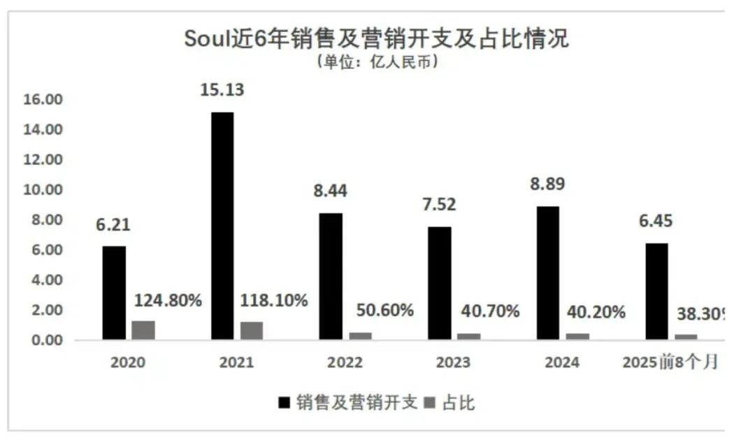 2022 年至 2024 年,Soul 的销售费用率从 50.6% 降至 40.2%;而 2019 年至 2021 年,这一数字曾高达 124% 和 118%。