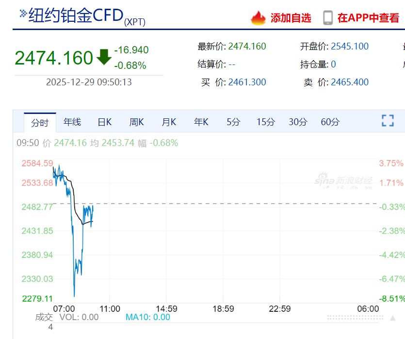 现货铂金盘中一度跌超 7%,目前跌幅收窄至 0.6%。