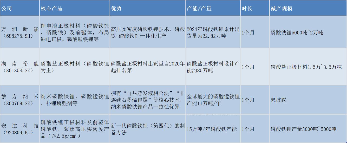 2025 年末,行业供不应求之际,4 家磷酸铁锂头部企业集体减产,进行为期 1 个月的检修。除德方纳米未披露减产规模外,另外 3 家共预计最多减产 6 万吨。