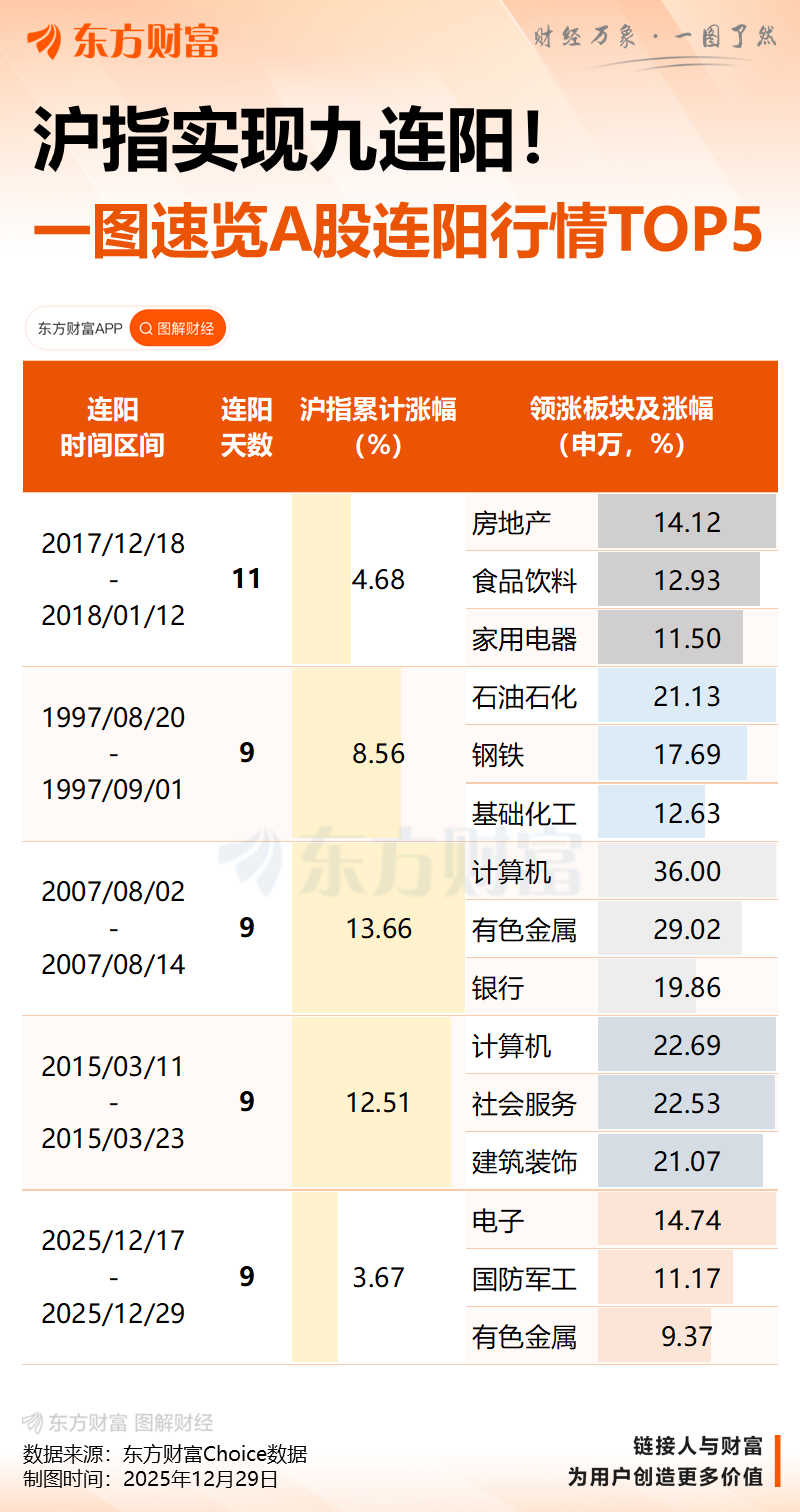 12 月 29 日,中信建投证券最新研报指出,经历了此前中期调整的完成,近期上证指数八连阳传递了积极信号,中信建投认为 A 股跨年行情已经启动。在机构投资者的一致乐观预期下,明年春季躁动行情有望提前;海外 AI 模型调整结束,美国战略重心西迁,海外流动性和风险持续改善;近期十五五产业政策与事件密集发布,投资者政策预期高涨;以上三大预期共同推动市场跨年行情启动。中期行业配置方面,重点关注具有一定景气催化的有色金属和 AI 算力,市场热点仍然以商业航天为主,次要热点主线包括海南自贸区、可控核聚变和人形机器人。