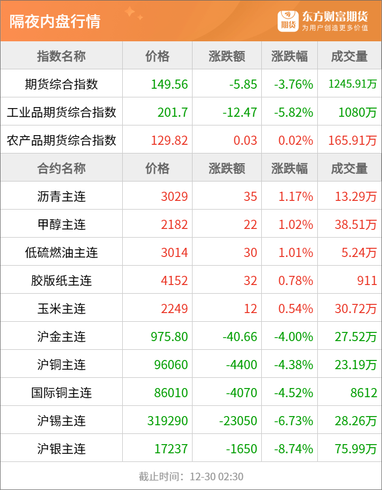 焦炭:12 月 29 日,河北部分钢厂对湿熄焦炭下调 50 元/吨、干熄焦炭下调 55 元/吨,2026 年 1 月 1 日零点执行,焦炭第四轮提降开启。(我的钢铁网)