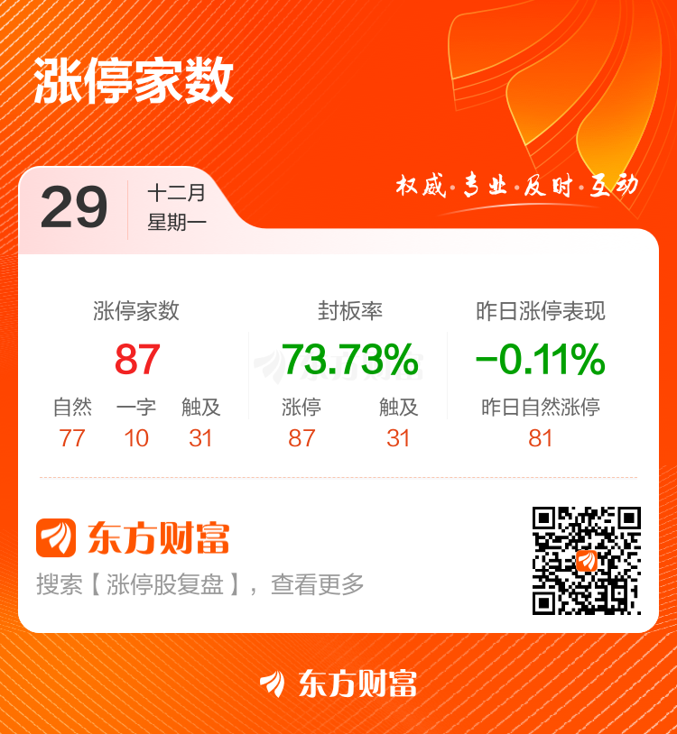 涨停个股数量方面,今日共计 87 股涨停,另有 31 只个股盘中一度触及涨停,封板率 73.73%。