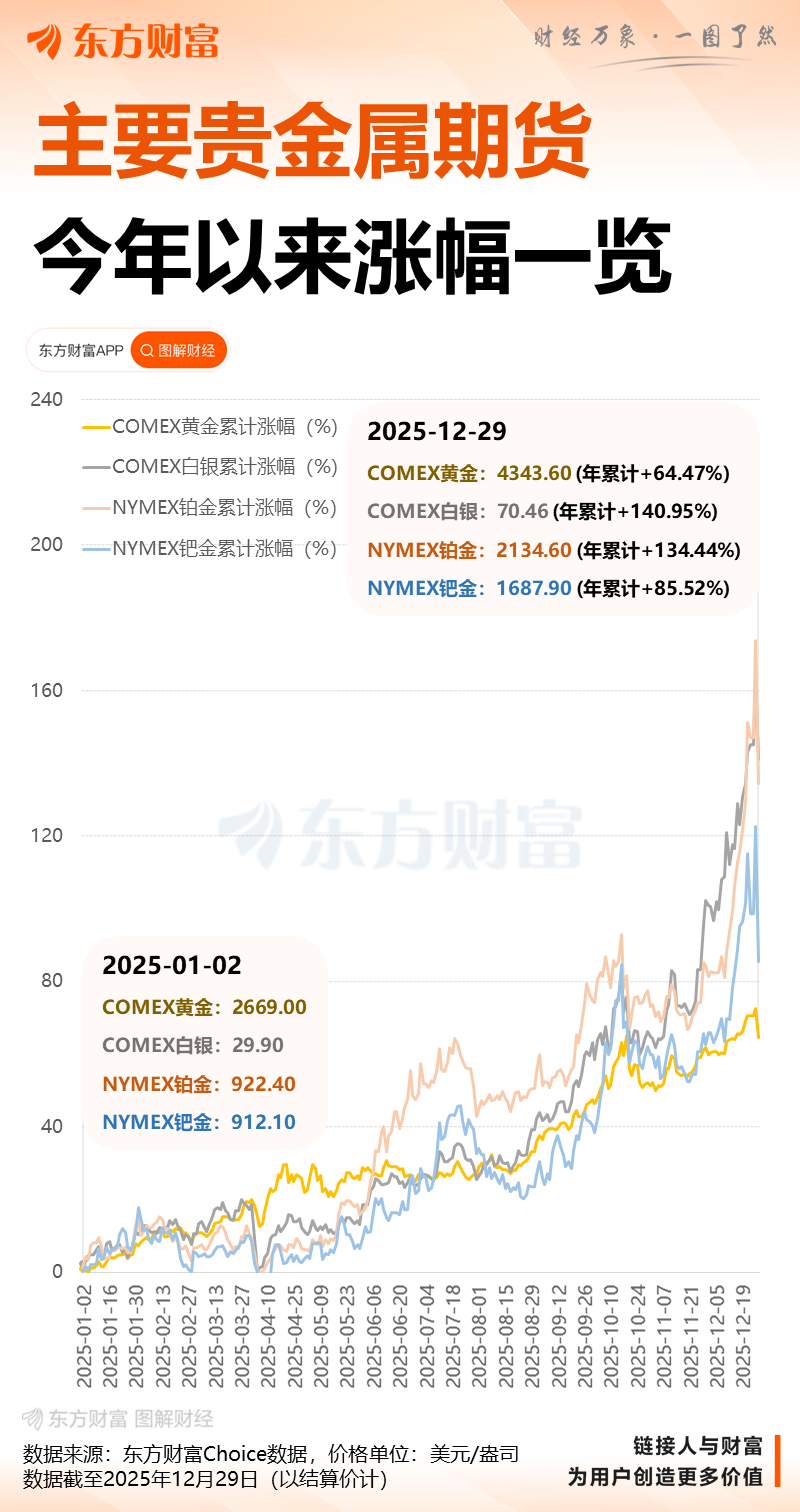 美东时间 12 月 29 日,以白银为首的贵金属全线重挫,截至收盘,COMEX 黄金期货大跌 4.45%,报 4350.2 美元/盎司;COMEX 白银期货暴跌 7.2%,报 71.64 美元/盎司;现货黄金大跌超 4%,现货白银暴跌超 9%,现货钯金暴跌超 15%,现货铂金暴跌超 14%。