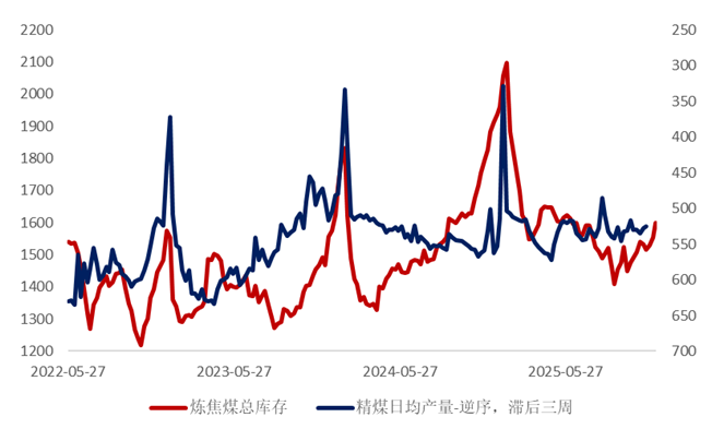 图 2 炼焦煤全口径库存 VS 精煤产量