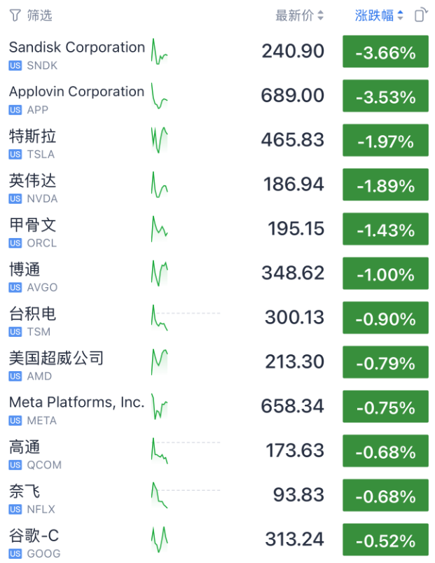 当日,「AI 交易」 板块承压。英伟达股价下跌接近 2%,回吐了上周超过 5% 涨幅的一部分。