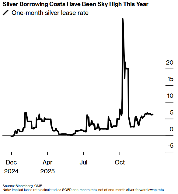 大量白银流入美国曾在 10 月份将伦敦市场推向全面紧缩,伦敦市场的借贷成本目前仍远高于接近零的正常水平。这为波动加剧和价格频繁飙升创造了条件。